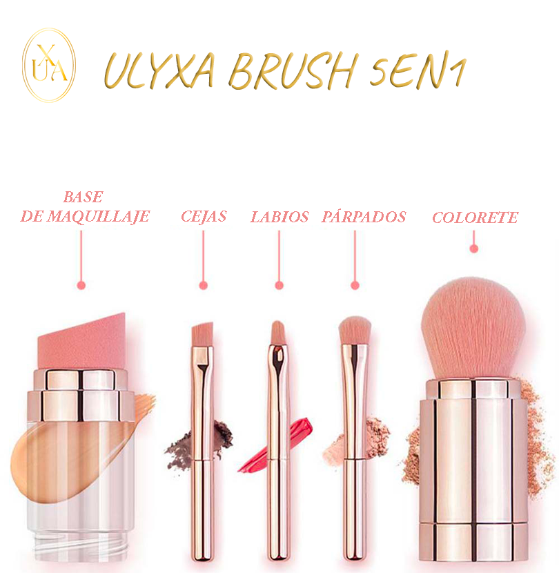 Descubre el poder del Ulyxa Brush 5 en 1, el compañero ideal para un maquillaje completo. Gracias a sus cinco pinceles esenciales, podrás aplicar tu maquillaje en todo el rostro con facilidad.